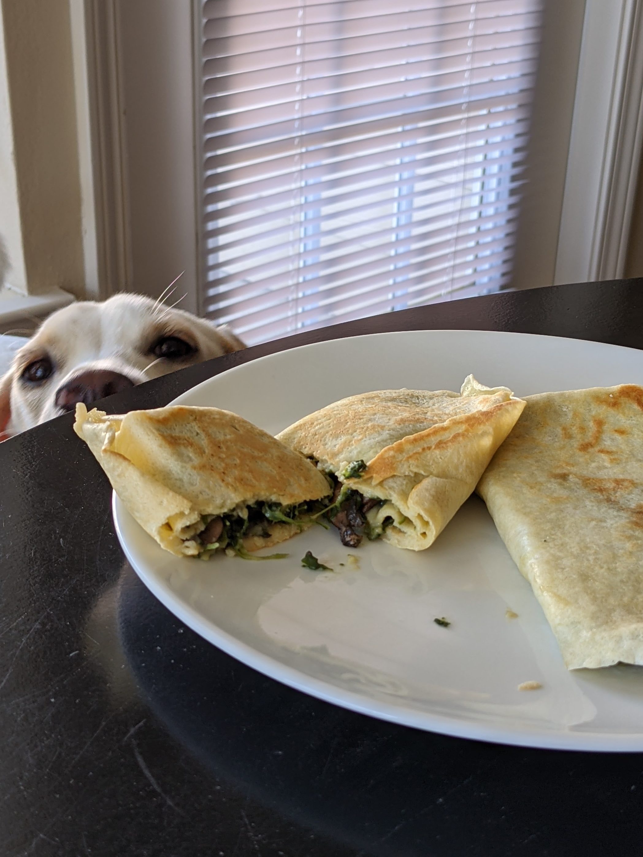 I only had 2/3 of the mushrooms necessary for the spinach filling, but I found that the recipe was easily divided into thirds. Since I was only making crepes for two, I opted to halve the recipe for the crepes as well.