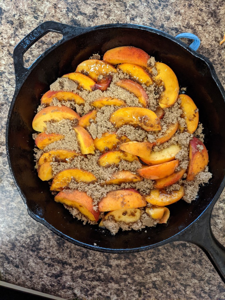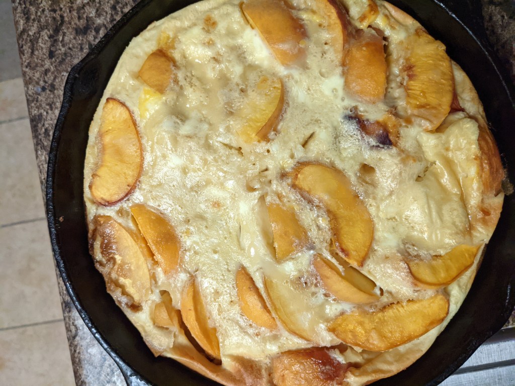 According to the Baker’s Companion, Clafouti is most often made with cherries but for this particular recipe, they modified it to use peaches. The peaches go on the bottom of a 10″ pan. I used my trusty cast iron.